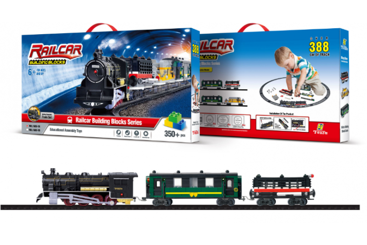Набор состоит из 350 деталей. При передвижении поезд издает звуковые эффекты работающего двигателя и гудка, так же установлен яркий светодиод, который включается и мерцает во время поездки.